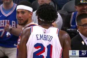 恩比德攤手聳肩抱怨布克犯規(guī)!后者嗆聲后直接離場(chǎng):全是球尼格!