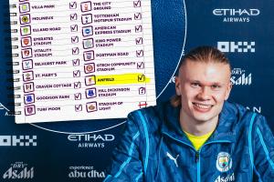 哈蘭德首次在安菲爾德進(jìn)球,英超出戰(zhàn)過的24個球場,他已攻破23個球場大門,只剩埃弗頓新球場——希爾·迪金森球場還未進(jìn)球。