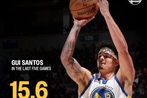 體育資訊2月9日訊 勇士官推今天曬圖分享了一組桑托斯近5場比賽打出的數(shù)據(jù):場均15.6分,運動戰(zhàn)命中率68.2%。
