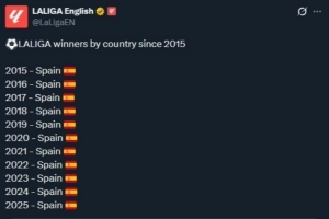 西甲官推隨后轉(zhuǎn)發(fā)了這條動(dòng)態(tài),并表示:“西班牙包攬了2015年至今的所有西甲冠軍?!?/p>