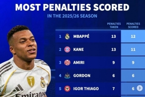 體育資訊2月10日訊 《轉(zhuǎn)會(huì)市場》統(tǒng)計(jì)了本賽季五大聯(lián)賽球員點(diǎn)球進(jìn)球情況,姆巴佩力壓凱恩居首。