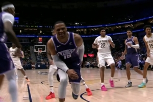 GIF-威少崴腳本來(lái)前場(chǎng)球,鵜鶘挑戰(zhàn)失敗補(bǔ)吹了瓊斯犯規(guī),威少獲得兩罰,全部命中繼續(xù)打