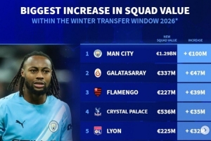 體育資訊2月10日訊 各大聯(lián)賽冬季轉(zhuǎn)會窗基本都已關(guān)閉,《轉(zhuǎn)會市場》也統(tǒng)計了經(jīng)歷這個冬窗之后的球隊身價上漲最多情況,曼城無懸念居首。