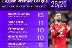 體育資訊2月10日訊 squawka統計了本賽季英超球員在運動戰(zhàn)創(chuàng)造重大機會情況,曼聯隊長B費依然領跑。