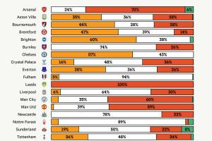 兩家曼徹斯特俱樂部則呈現(xiàn)出相似的支出特征,將大約60%的轉(zhuǎn)會費用于25至28歲的球員。