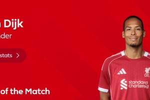 本場(chǎng)比賽范戴克打進(jìn)全場(chǎng)唯一進(jìn)球,賽后也當(dāng)選英超官方球迷票選全場(chǎng)最佳球員。