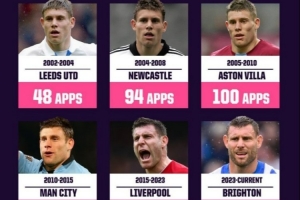 米爾納英超生涯出場次數(shù)分布:代表利物浦230場最多,曼城147場