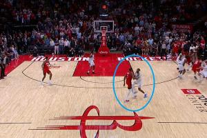 火箭最后一攻邊線(xiàn)發(fā)球時(shí),小卡緊跟杜蘭特,雖然后者借助擋拆甩開(kāi)倫納德,但小瓊斯及時(shí)補(bǔ)防讓KD始終沒(méi)有接到球,最終火箭只能傳給伊森強(qiáng)行出手,未能命中。