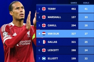體育資訊2月12日訊 德國轉(zhuǎn)會市場統(tǒng)計了英超歷史上中后衛(wèi)進球數(shù)據(jù)排名,約翰·特里41球居首,范戴克27球第四。