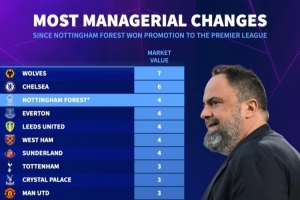 體育資訊2月12日訊 諾丁漢森林官方宣布,主帥戴奇下課。德國(guó)轉(zhuǎn)會(huì)市場(chǎng)統(tǒng)計(jì)了諾丁漢森林2022-2023賽季開始征戰(zhàn)英超以來,英超各隊(duì)的換帥人數(shù),狼隊(duì)7人最多,切爾西6人第二,諾丁漢森林4人并列第三,即將任命第5位主帥。