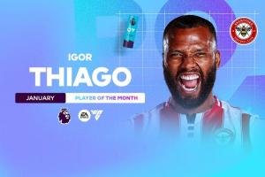 1月份伊戈爾·蒂亞戈出戰(zhàn)5場比賽打進(jìn)5球,幫助布倫特福德取得2勝1平2負(fù)的戰(zhàn)績,他也擊敗了恩佐、多爾古、維爾茨等候選,繼去年11月后第二次當(dāng)選英超月最佳球員。