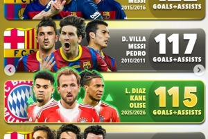 3、2025/26賽季,拜仁(凱恩,奧利塞、迪亞斯)115球