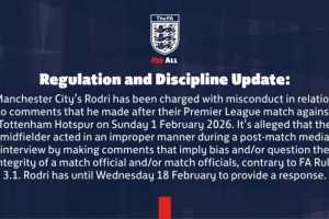 英足總官方寫道:“監(jiān)管與紀(jì)律更新:曼城的羅德里因在2026年2月1日周日對陣熱刺的英超比賽后發(fā)表的言論,被指控行為不當(dāng)?!?/p>