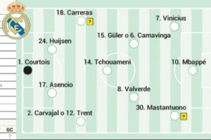 上輪停賽的維尼修斯此役回歸先發(fā),前場三人還有姆巴佩以及馬斯坦托諾。右后衛(wèi)位置卡瓦哈爾和阿諾德都可能在此役首發(fā)出戰(zhàn),中場居萊爾以及卡馬文加將爭奪一個(gè)先發(fā)位置。