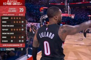 第二位出場的利拉德依然延續(xù)了首輪的炸裂手感,中圈5個點(diǎn)全中拿下29分的高分;