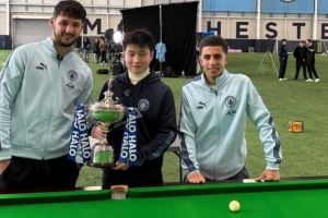 體育資訊2月15日訊 世界斯諾克巡回賽官方社媒分享世界冠軍趙心童到訪曼城足球俱樂部照片,趙心童與里科·劉易斯和詹姆斯·特拉福德會面,并在標準斯諾克球臺上向兩位球員傳授了些許技巧。