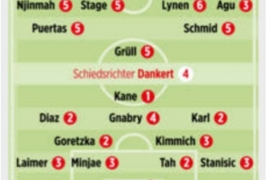 體育資訊2月15日訊 德甲第22輪比賽,拜仁客場(chǎng)3-0擊敗不萊梅,《圖片報(bào)》對(duì)兩隊(duì)球員進(jìn)行了評(píng)分。