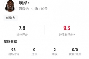 體育資訊2月16日訊 阿森納在本輪足總杯對陣維岡競技,埃澤本場數(shù)據(jù)如下: