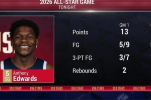 體育資訊2月16日訊 NBA全明星正賽循環(huán)賽2場(chǎng)戰(zhàn)罷,美國(guó)新星隊(duì)目前1勝1負(fù)。