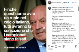 薩維亞諾對馬洛塔的抨擊十分直接,他甚至在 Instagram發(fā)文時配上了馬洛塔的照片。身為那不勒斯死忠的薩維亞諾特意強(qiáng)調(diào),自己的立場與球隊無關(guān),他說:“這不是球衣顏色的問題,也不是體育層面的好惡問題。這不是國際米蘭對陣某支球隊的問題,而是體系的問題。當(dāng)一份司法裁定明確指出,存在某些‘受控局面’時,這件事就不再是酒吧里的閑聊話題,而是上升到了體制與結(jié)構(gòu)性問題。當(dāng)意大利足壇面對如此敏感的事件,卻采取選擇性謹(jǐn)慎、集體沉默,或是推出隨后被事實戳穿的官方說辭時,問題就不再是一場比賽的結(jié)果。”