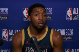 體育資訊2月16日訊 NBA全明星正賽冠軍賽,美國星條隊(duì)21-47不敵美國新星隊(duì),賽后,多諾萬·米切爾接受了記者采訪。