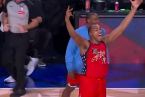 體育資訊2月16日訊 NBA全明星正賽循環(huán)賽,世界隊加時35-37惜敗美國新星隊。