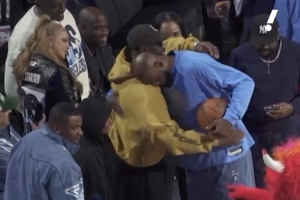 雅虎體育官方Instagram曬出一段比賽期間的花絮:詹姆斯和場(chǎng)邊觀戰(zhàn)的韋德?lián)粽撇肀е乱?,隨后詹姆斯又擁抱了自己的母親。