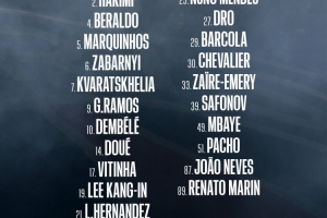 前鋒:7-克瓦拉茨赫利亞、9-貢薩洛·拉莫斯、10-登貝萊、14-杜埃、29-巴爾科拉、49-姆巴耶