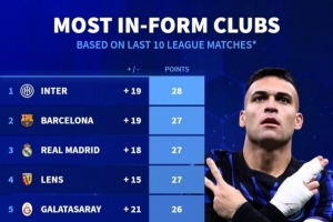 體育資訊2月16日訊 德國(guó)轉(zhuǎn)會(huì)市場(chǎng)列出了前10聯(lián)賽近10輪拿分排名,國(guó)米拿到28分居首,巴薩、皇馬、朗斯拿到27分。