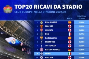 上賽季歐洲俱樂部球場(chǎng)門票收入排名: