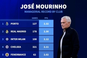 穆里尼奧執(zhí)教不同球隊(duì)場均積分: