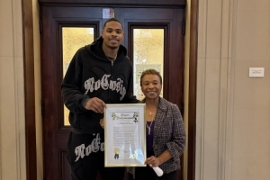 Marc J. Spears寫道:“邁阿密熱火前鋒凱沙·約翰遜在周日贏下NBA扣籃大賽后,今日在奧克蘭市政廳獲頒來自奧克蘭市長Barbara Lee及市議會(huì)議員的嘉獎(jiǎng)令。”
