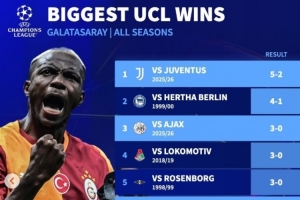 體育資訊2月18日訊 歐冠1/8決賽附加賽首回合,加拉塔薩雷5-2大勝尤文,根據(jù)德轉(zhuǎn)統(tǒng)計,本場比賽是加拉塔薩雷的歐冠聯(lián)賽最大比分勝利。