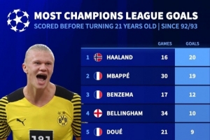 體育資訊2月18日訊 巴黎在本輪歐冠附加賽首回合3-2逆轉(zhuǎn)摩納哥,杜埃替補雙響,數(shù)據(jù)統(tǒng)計顯示他也是歐冠歷史進球第5多的U21球員。