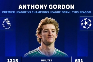 體育資訊2月19日訊 歐冠附加賽首回合比賽,戈登打進(jìn)4球,紐卡客場(chǎng)6-1擊敗卡拉巴赫。德國(guó)轉(zhuǎn)會(huì)市場(chǎng)統(tǒng)計(jì)了戈登本賽季英超、歐冠數(shù)據(jù),并做出對(duì)比。