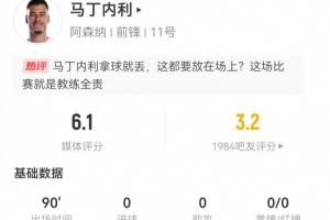體育資訊2月19日訊 阿森納在本輪英超2-2被狼隊絕平,馬丁內(nèi)利本場數(shù)據(jù)如下: