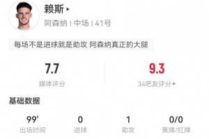 體育資訊2月19日訊 阿森納在本輪英超對陣狼隊,賴斯本場數(shù)據(jù)如下: