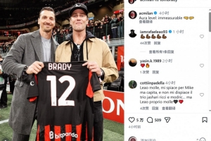 NFL傳奇四分衛(wèi)布雷迪來到圣西羅球場,現(xiàn)場觀看這場比賽,他與伊布合影,并獲贈印有自己名字的米蘭球衣。