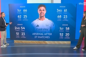 阿森納本賽季英超27輪比賽戰(zhàn)績17勝7平3負(fù)積58分,天空體育統(tǒng)計(jì)了阿森納近4個賽季的同期數(shù)據(jù)。