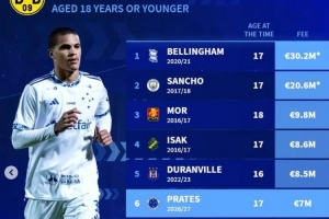 體育資訊2月19日訊 多特已經(jīng)官宣簽下克魯塞羅17歲后衛(wèi)普拉特斯,德轉(zhuǎn)統(tǒng)計(jì)顯示他也是多特隊(duì)史第6貴的U18引援。