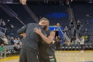 將要首秀的新援波爾津吉斯賽前進(jìn)行了熱身,而他的綠軍前隊(duì)友杰倫·布朗與懷特則是上來與其進(jìn)行了互動(dòng)。