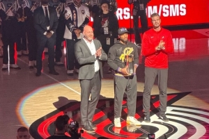 利拉德帶著第三座三分大賽獎(jiǎng)杯回到波特蘭,并在主場球迷歡呼中舉起了獎(jiǎng)杯。