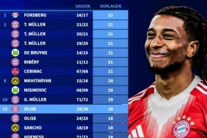 11.、奧利塞(拜仁,24/25和25/26賽季):18次