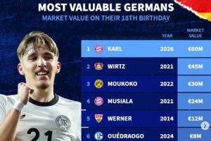 體育資訊2月22日訊 拜仁小將卡爾今日迎來18歲生日,數(shù)據(jù)統(tǒng)計顯示他也是歷史同齡德轉(zhuǎn)身價最貴的德國球員。