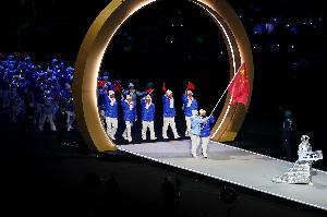 米蘭冬奧會(huì)閉幕進(jìn)行中,蘇翊鳴擔(dān)任中國代表團(tuán)旗手入場(chǎng)