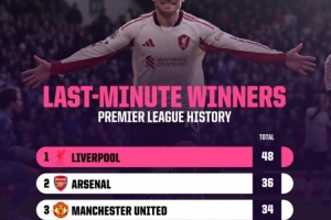 以下為英超歷史球隊(duì)在90分鐘后打進(jìn)絕殺次數(shù)榜,具體如下: