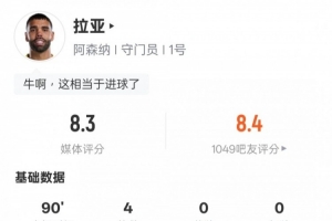 體育資訊2月23日訊 英超第27輪焦點戰(zhàn),阿森納4-1戰(zhàn)勝熱刺。拉亞首發(fā)出戰(zhàn),表現(xiàn)出色,貢獻全場最多的4次撲救,評分8.3。