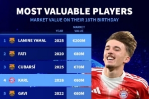體育資訊2月23日訊 德國轉(zhuǎn)會市場列出了球員18歲生日當天身價排名,亞馬爾2億歐居首,法蒂8000萬歐次席,庫巴西7000萬歐,卡爾6000萬歐。