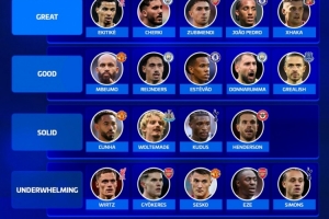 良好——姆伯莫(曼聯(lián))、賴(lài)因德斯(曼城)、埃斯特旺(切爾西)、多納魯馬(曼城)、格拉利什(埃弗頓)