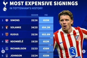 體育資訊1月15日訊 熱刺已經(jīng)官宣簽下馬競(jìng)中場(chǎng)加拉格爾,《轉(zhuǎn)會(huì)市場(chǎng)》也統(tǒng)計(jì)了熱刺隊(duì)史引援榜情況,哈維·西蒙斯等4將超過(guò)6000萬(wàn)歐元。
